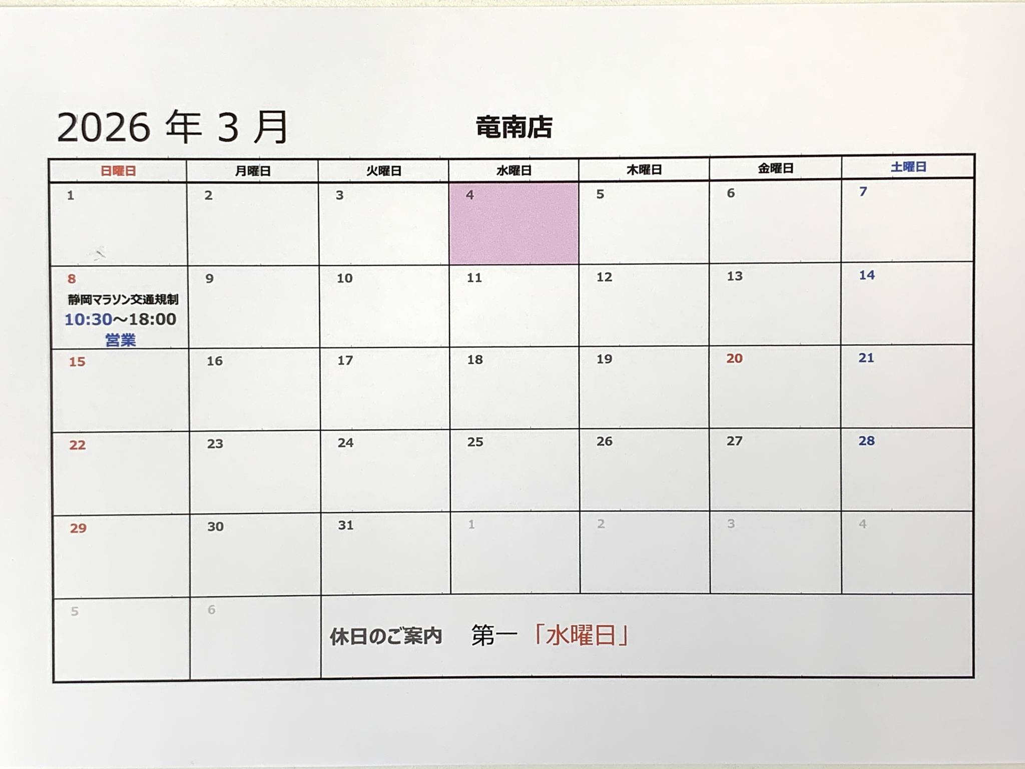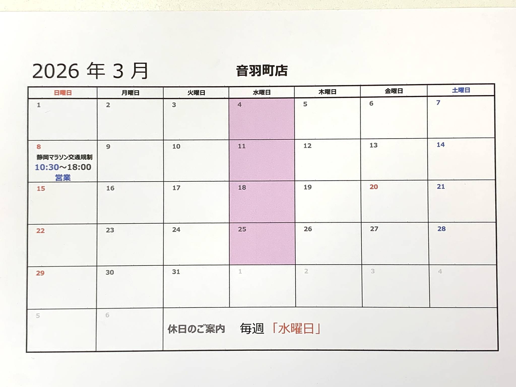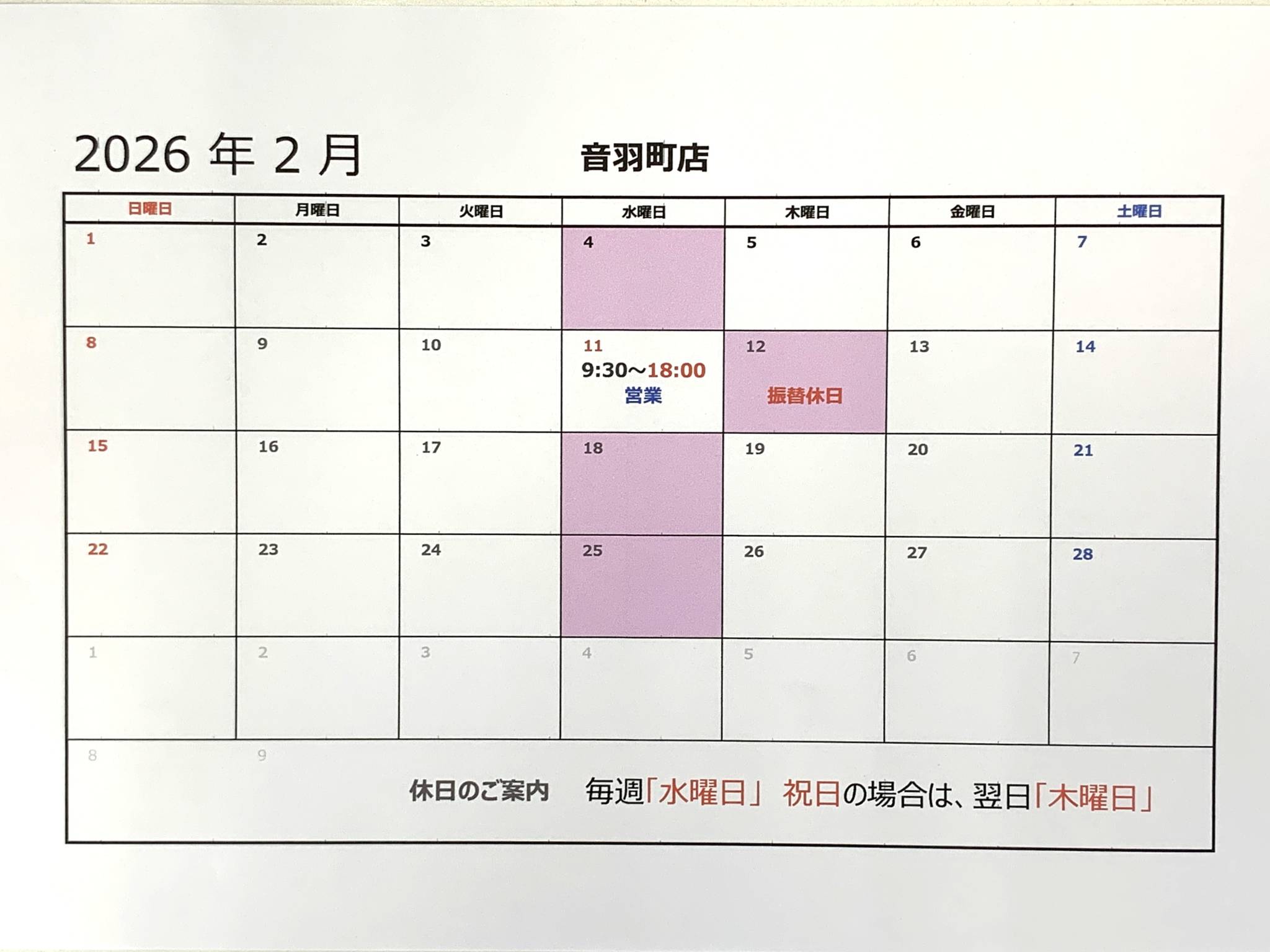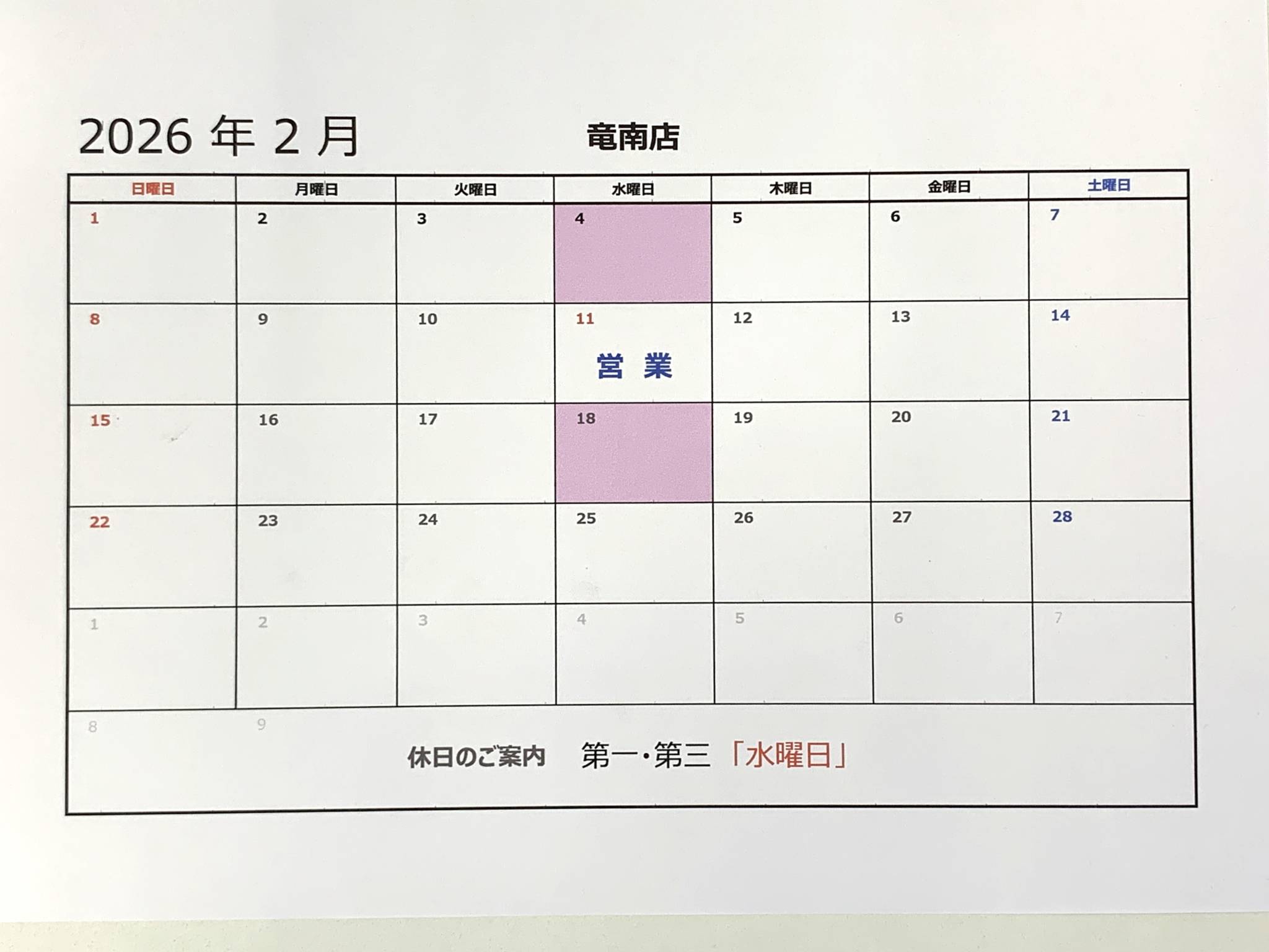 2月・3月営業日のご案内